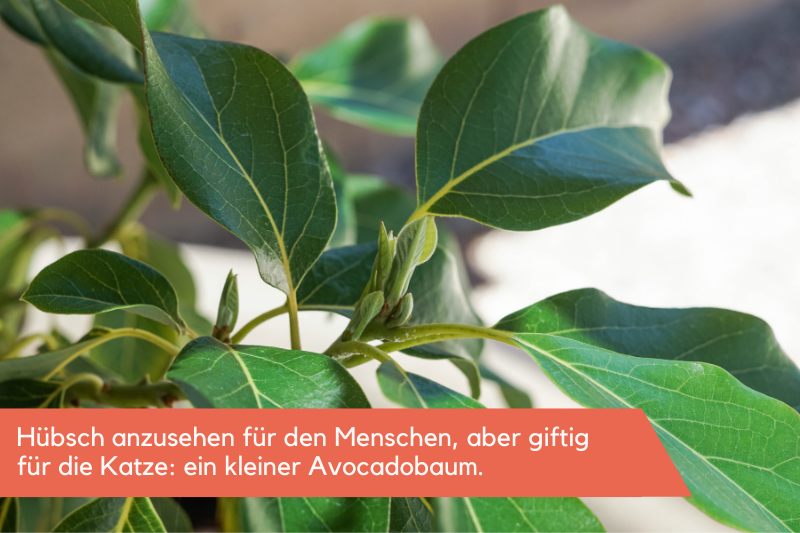 Das Toxin Persin ist in allen Bestandteilen der Avocadopflanze enthalten. Deshalb sollten auch selbst gezüchtete Avocadobäumchen von der Katze ferngehalten werden, indem sie an einem Platz stehen, den die Katze nicht erreichen kann. Auch das Anknabbern der Blätter der Avocadobäumchen kann bereits zu einer Vergiftung führen.